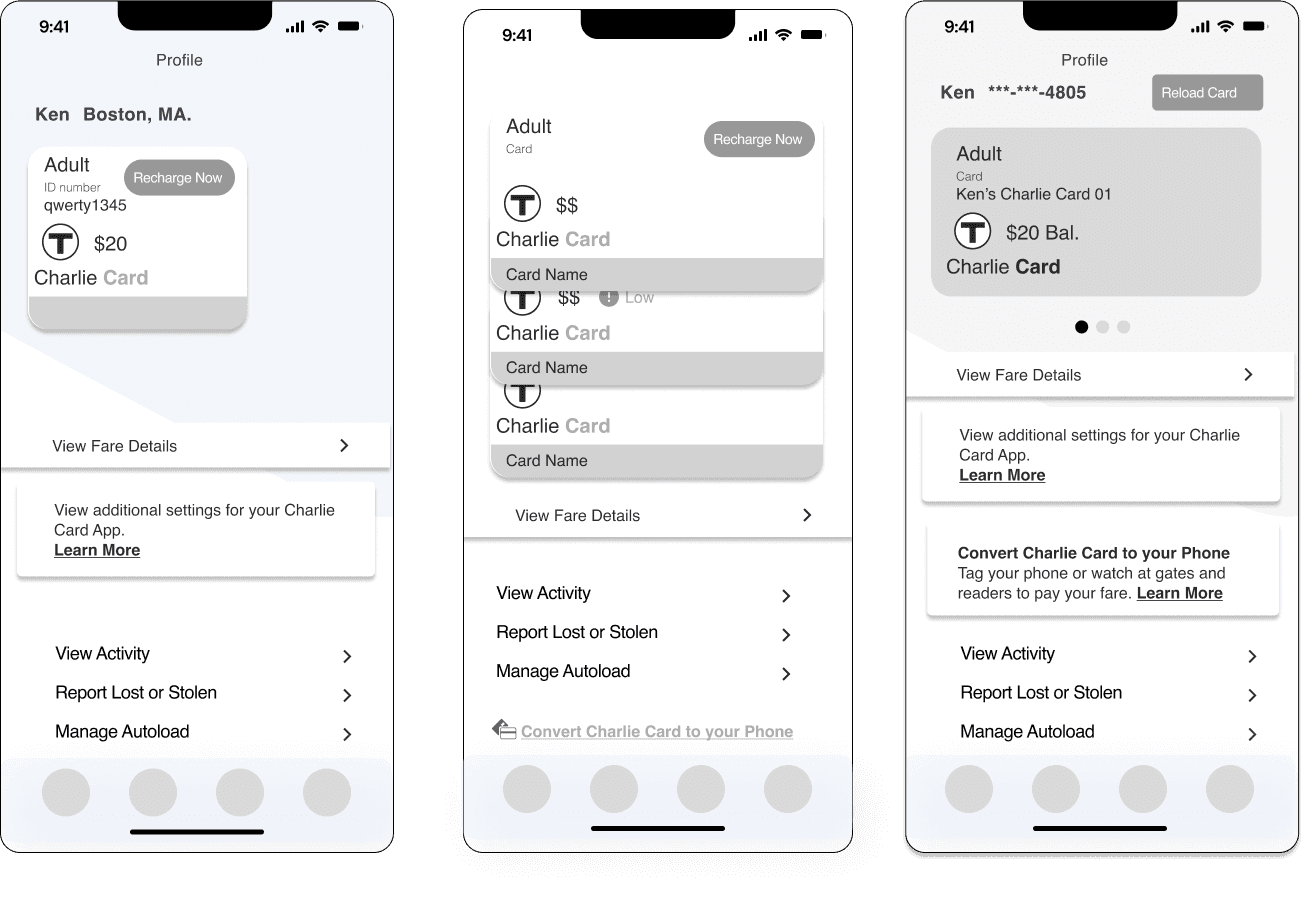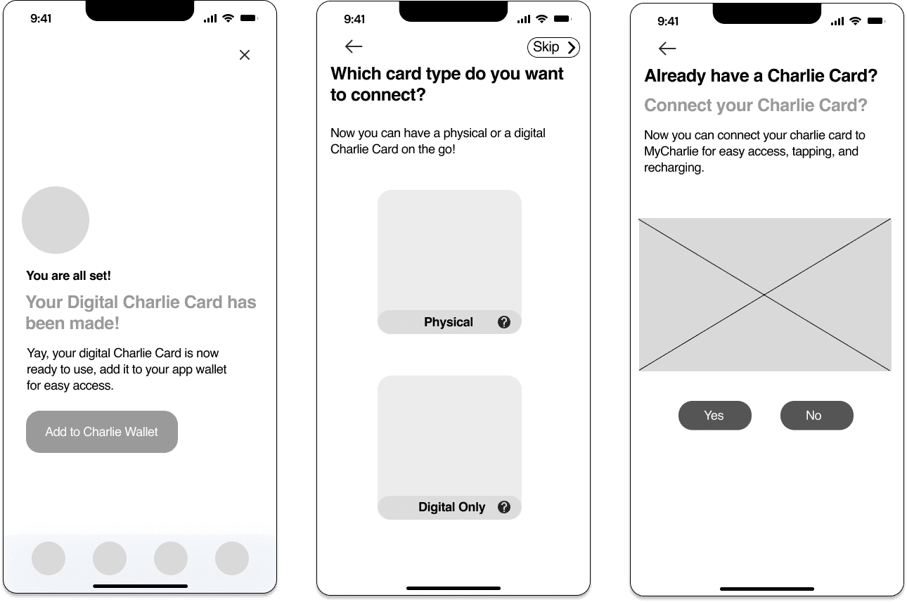 To tackle this we proposed the design of a mobile-first platform to digitize the MBTA Charlie Card. By synthesizing user pain points into a seamless digital interface, the team optimized the user journey, reducing physical touchpoint friction and enhancing overall transit accessibility.