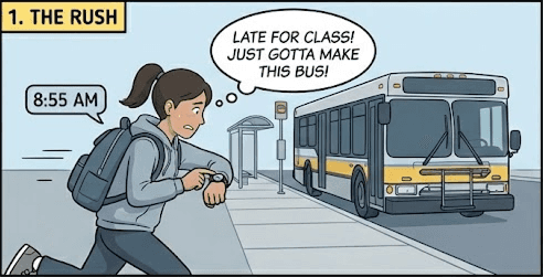 Imagine you’re sprinting for the 8:55 AM bus, already late for a final exam.