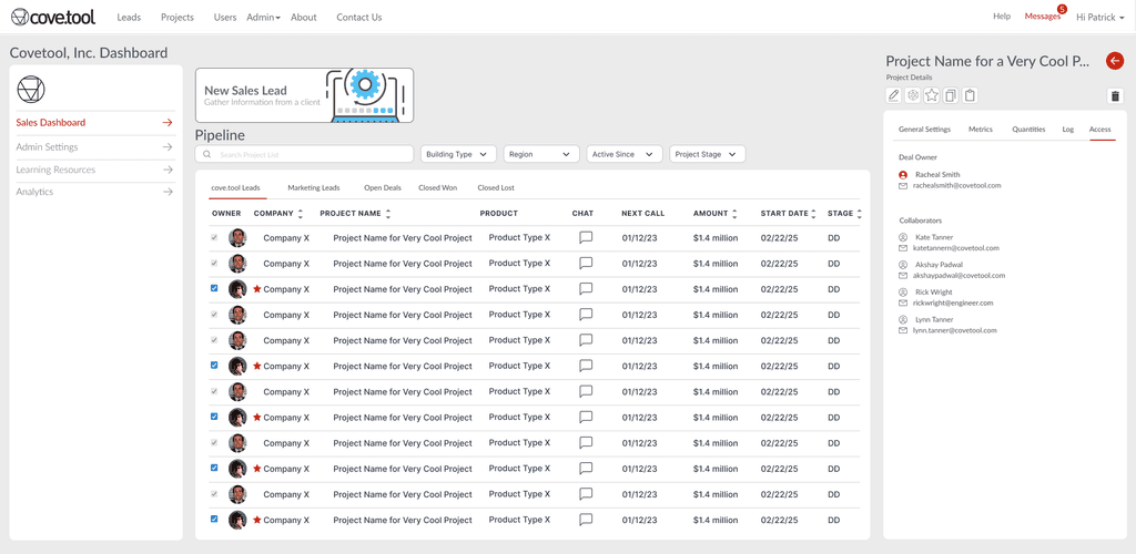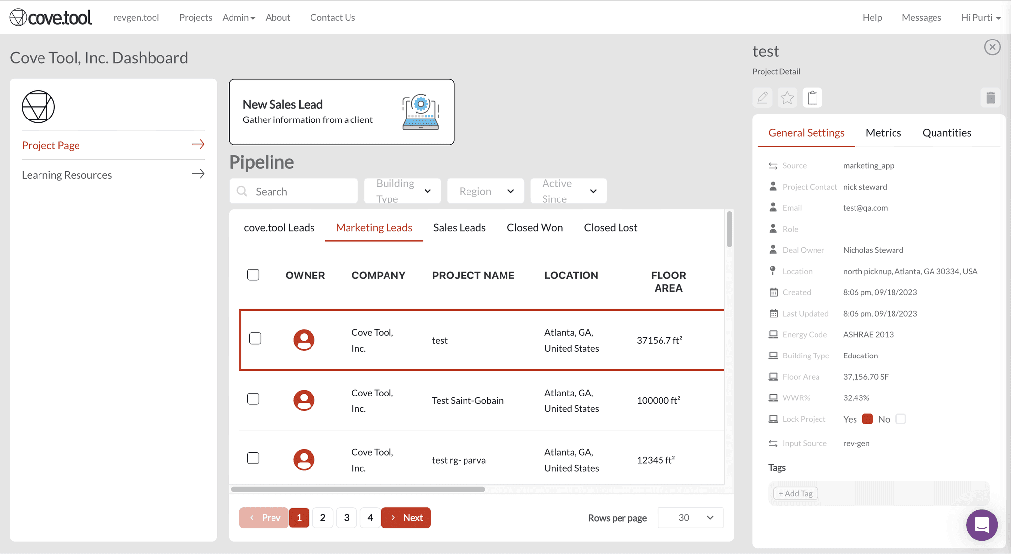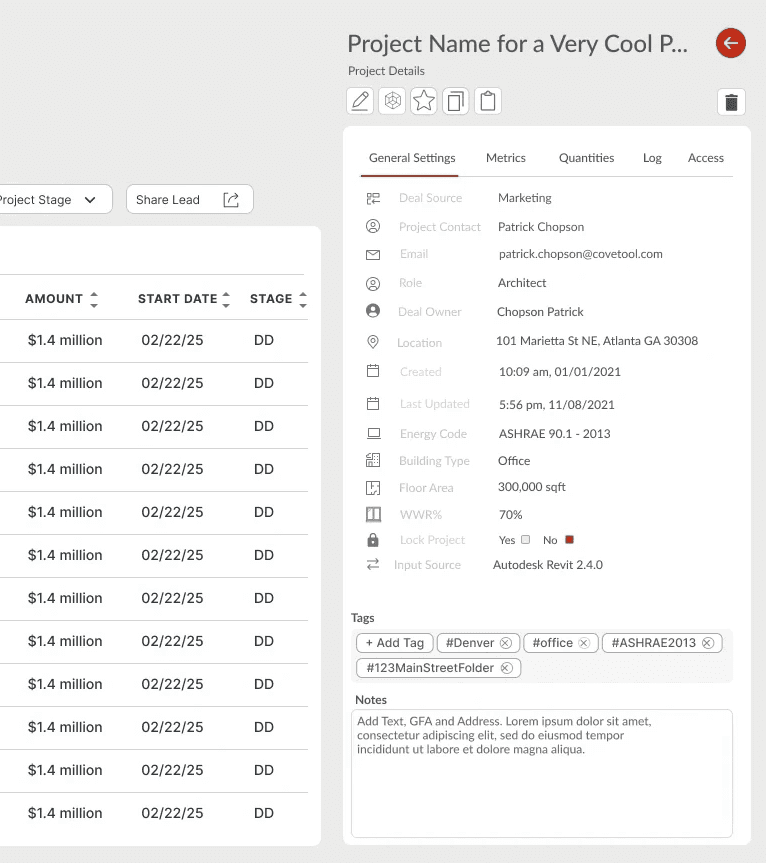 Designed a collapsable information panel with General Settings as the default tab, and additional project specifics like Metrics, Quantities, Logs (prior discussions) and point of Lead Access in the information panel.