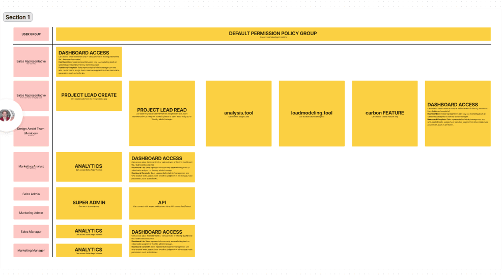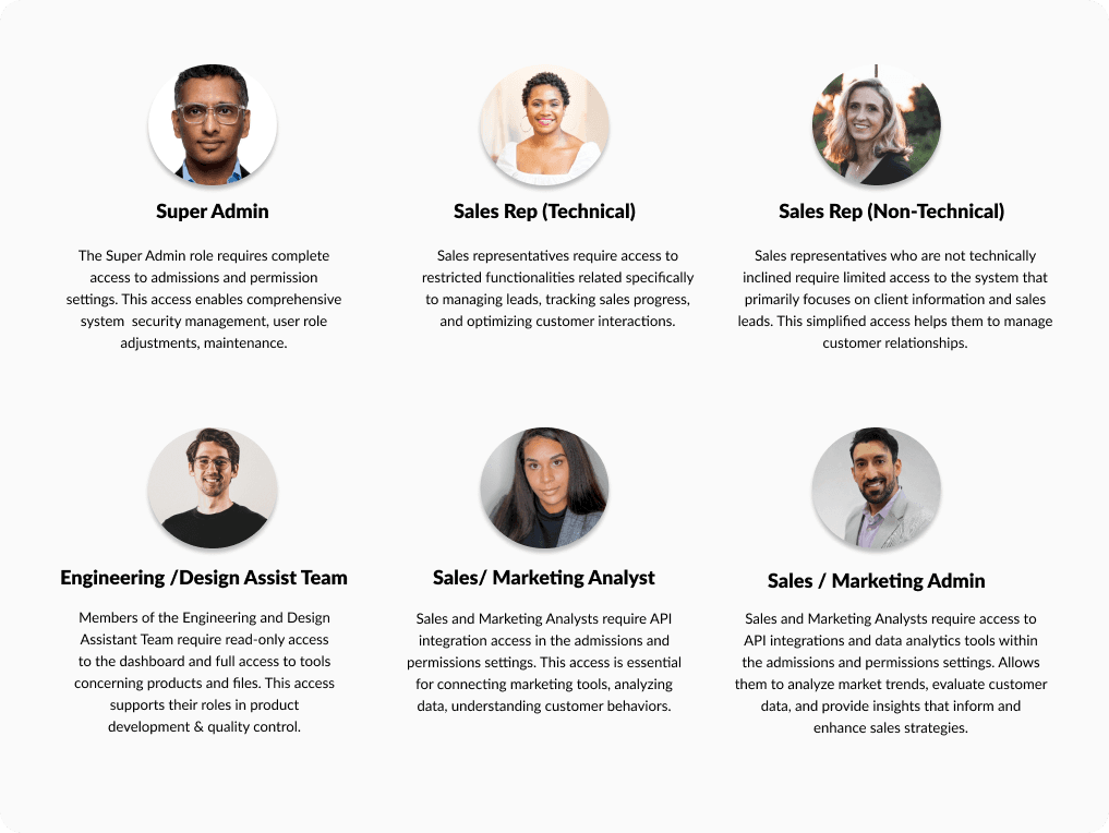 "Our user base includes super admins, business owners, administrators, designers, technical and non-technical staff, and marketing and sales representatives. However, since the permissions, is widely used across the company to grant and restrict access, our personas need to be flexible and inclusive of various functionalities that may overlap. functionalities which may overlap.