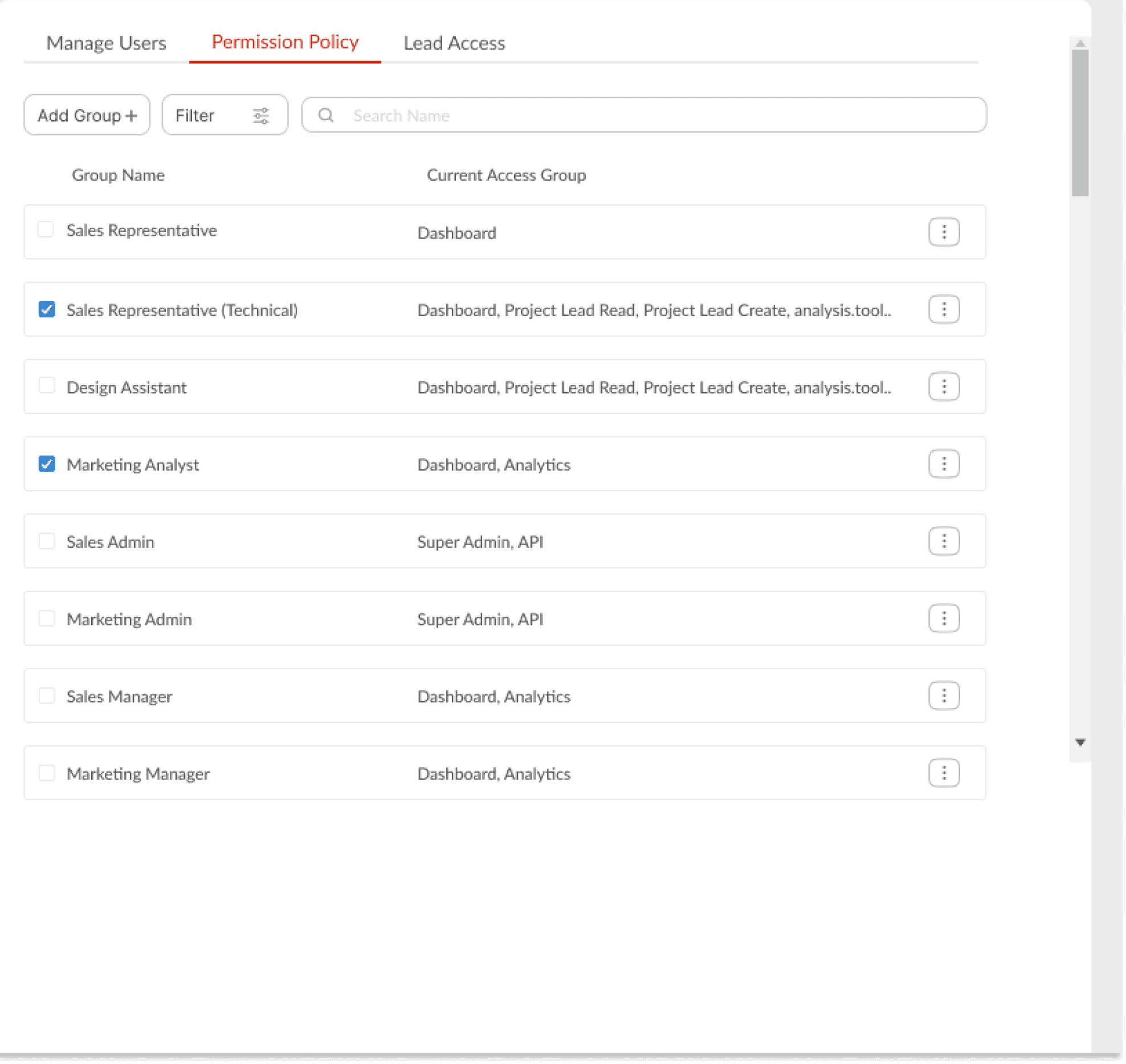 This section discusses the Admin Settings access dashboard, which is only visible to the super admin. The super admin can change and edit permissions and policies from this dashboard. The dashboard comprises multiple functions, such as managing the user database, changing permission policies, and accessing leads to share or transfer them.